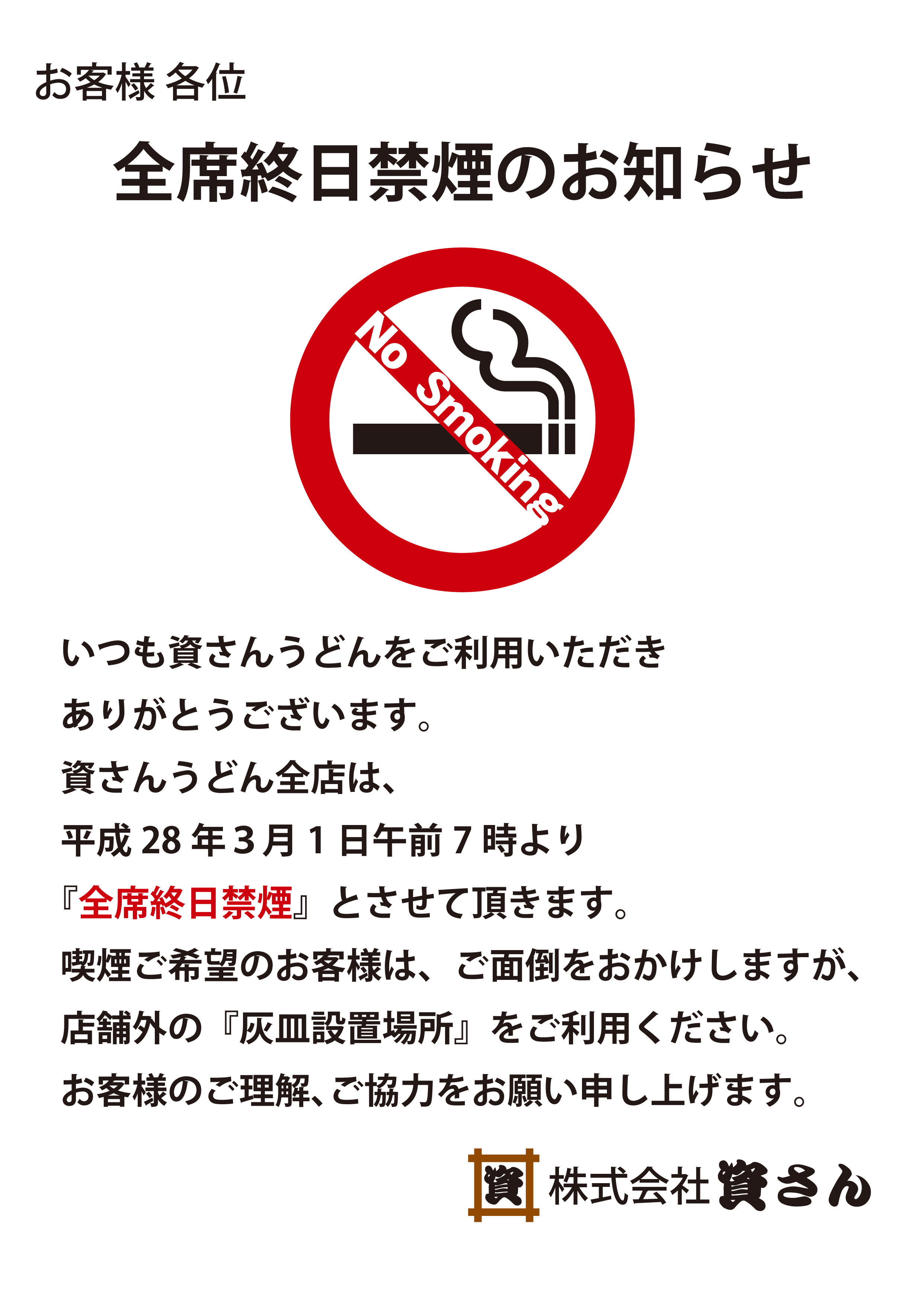 2016年02月04日 全店舗禁煙のお知らせ 日ごろより資さんうどんをご愛顧賜り誠にありがとうございます。 3月1日午前7時より、全店舗で「全席終日禁煙」とさせて頂きます。 喫煙のご希望のお客様には大変ご迷惑をおかけしますが、 店舗外の「灰皿設置場所」をご利用下さい。 お客様のご理解、ご協力をお願い申し上げます。
