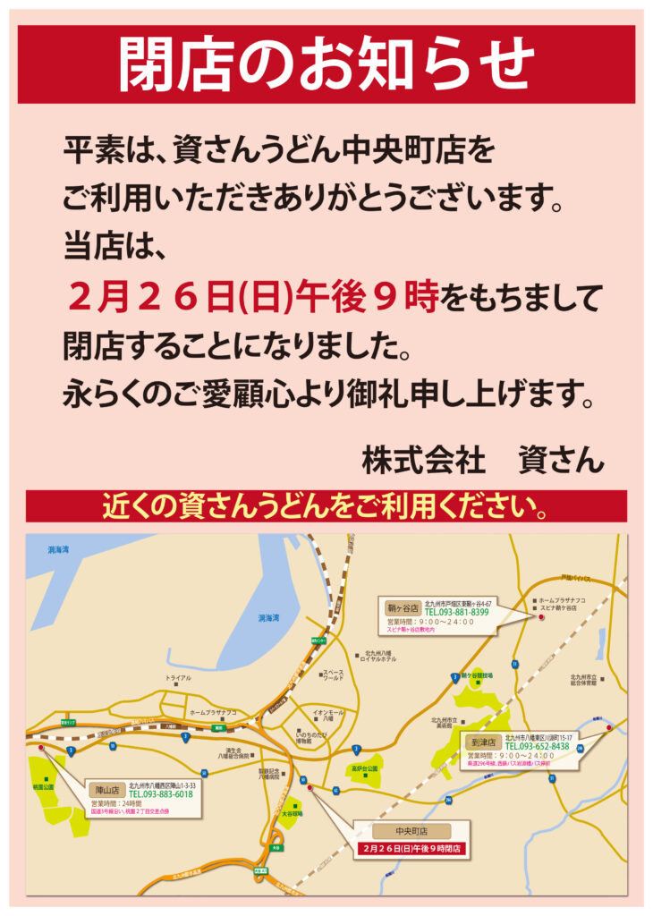 2017年02月09日 資さんうどん中央町店 閉店のお知らせ 昭和56年より永らくご愛顧賜りました中央町店(八幡東区)ですが、平成29年2月26日(日)午後9時をもって閉店することになりました。 多くのお客様に愛されてきましたこと心より篤く御礼申し上げます。ありがとうございました。