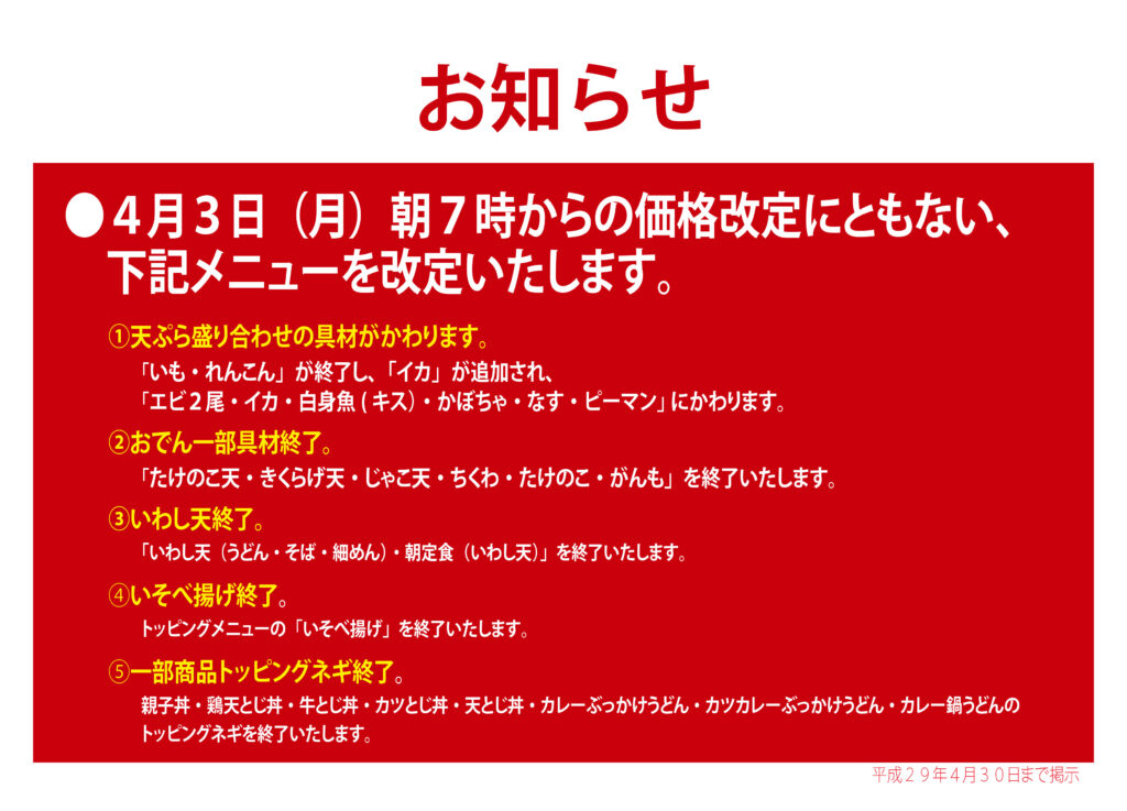 2017年03月24日 一部メニュー内容の改定について 店頭にもポスター掲示しておりますが、4月3日午前7時より、一部メニューの内容改定を行います。 お客さまには何卒ご理解賜りますようお願い申し上げます。