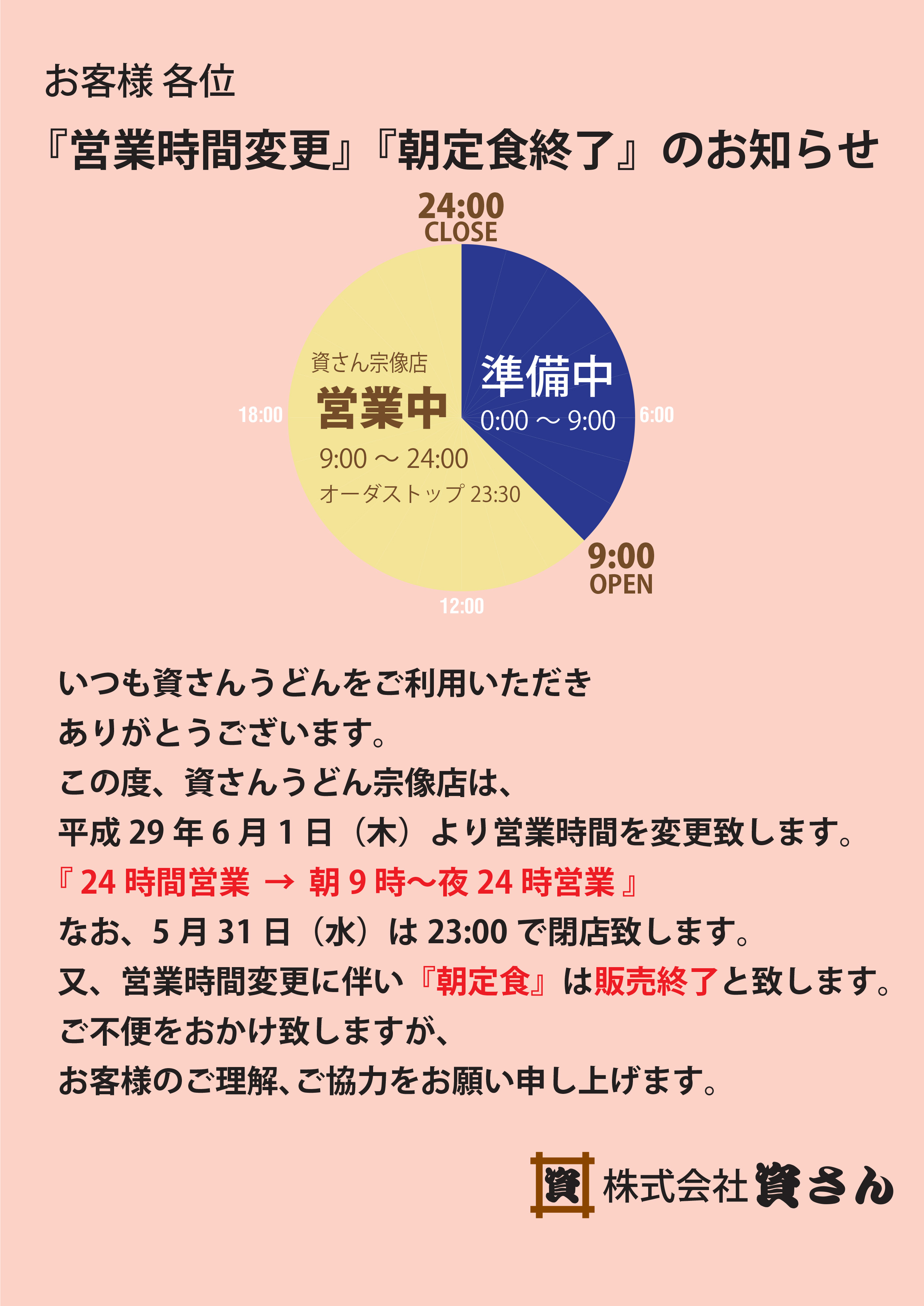 2017年05月18日 宗像店 営業時間変更のお知らせ 資さんうどん宗像店は、6月1日より午前9時~深夜24時の営業時間となります。 これに伴い、朝定食を終了いたします。 近隣の岡垣店、古賀店は24時間営業ですので、深夜早朝ご利用のお客様はどうぞそちらの店舗をご利用くださいませ。 お客さまにはたいへんご迷惑をおかけいたしますが、深夜帯の従業員不足のため、なにとぞご理解賜りますようお願い申し上げます。