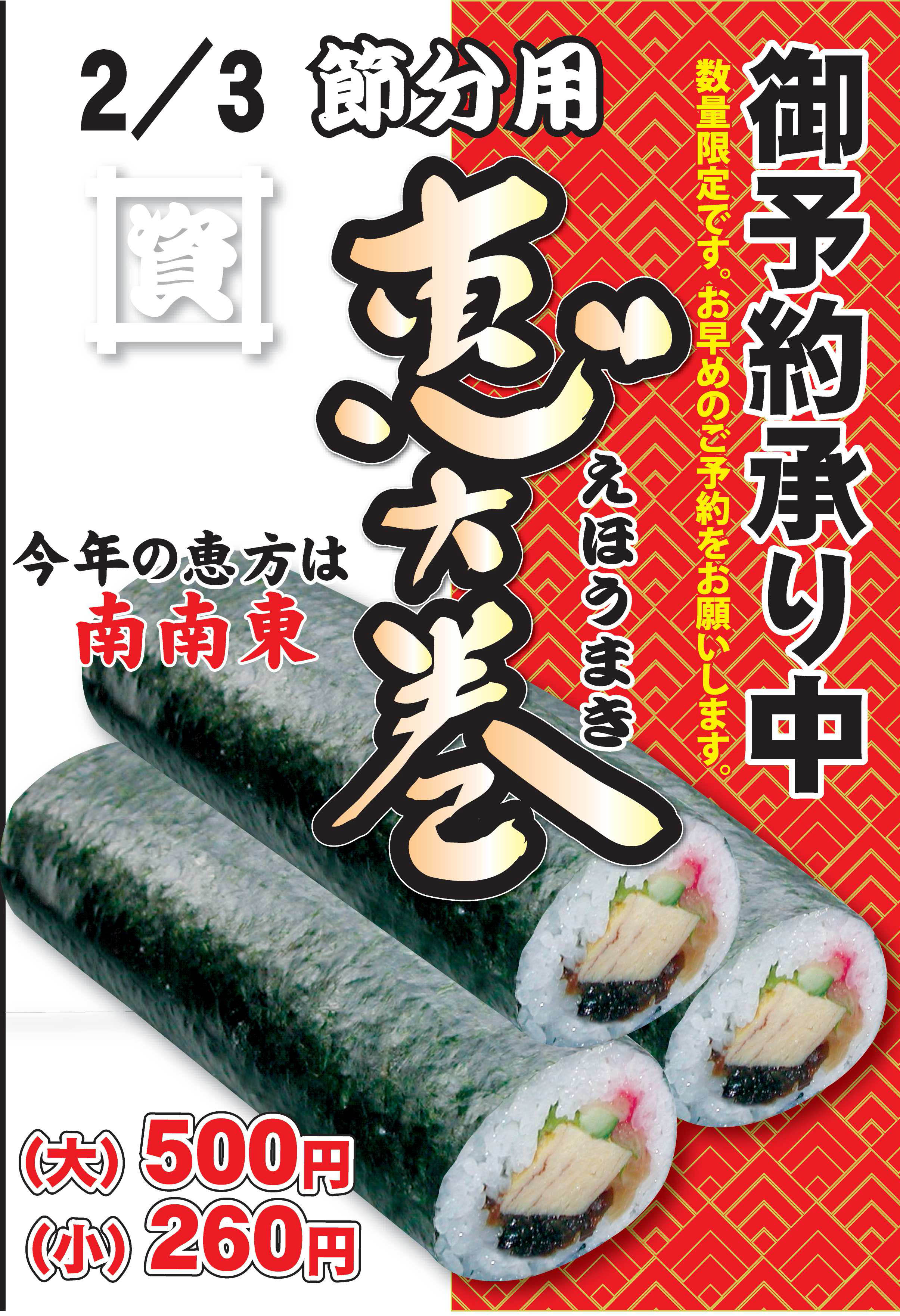 2018年01月15日 節分恵方巻 ご予約承り開始 今年の恵方は「南南東」。 資さんの恵方巻は、長年にわたりお客様に支持されてきた「味巻寿司」丸々1本(八切れ相当)。 ハーフサイズ(四切れ相当)もございます。 どうぞお近くの店舗でお早めにご予約ください。