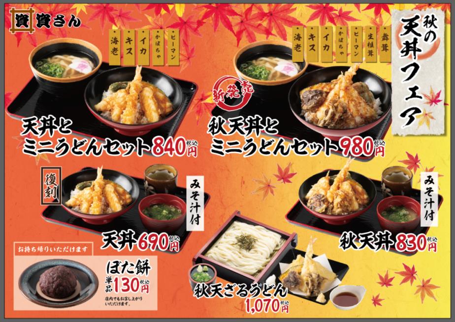 資さん定番メニューの「ミニうどん」は「天丼・秋天丼」との相性抜群、食欲の秋にぴったりの組み合わせ。