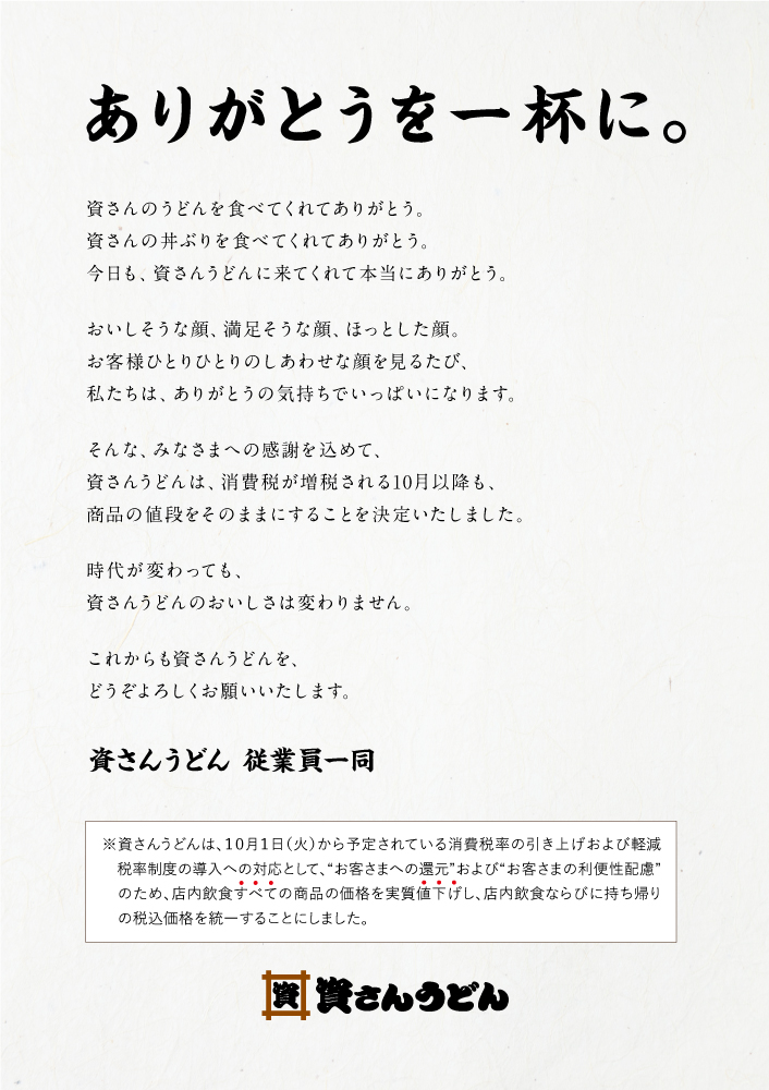 資さんうどんでは、10月1日(火)から開始されました、消費税率の引き上げおよび軽減税率制度の導入への対応として、“お客さまへの感謝の気持ち”と“お客さまの利便性”を最優先と考え、店内飲食すべての商品の価格を実質値下げし、店内飲食ならびに持ち帰りの税込価格を統一しております。