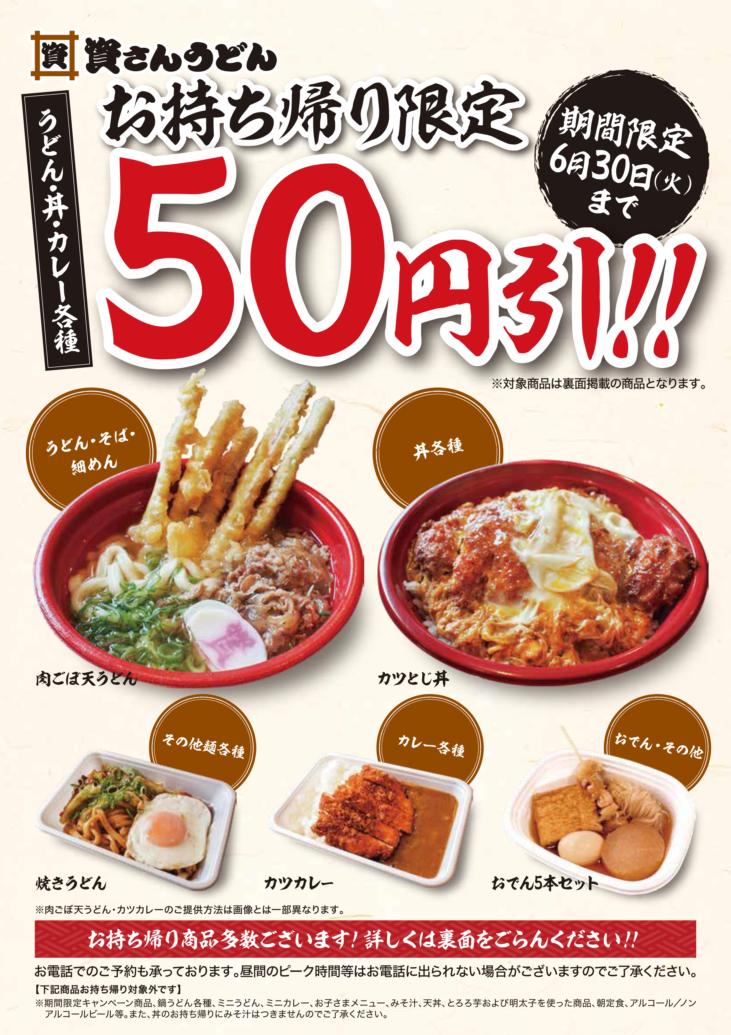 ご自宅や職場等でのお食事需要のさらなる高まりを受け、より多くの「資さんうどん」のお持ち帰り商品を気軽にご利用頂けるよう、うどん・丼・カレー等各種商品(全41品)を、お持ち帰りのみ5月9日(土)~6月30日(火)までの期間限定で、お試し価格として、50円引にてご提供します。対象商品として、多くの人気商品をラインナップ!「資さんうどん」のお持ち帰り商品は、ご自宅や職場等で「店舗の味をそのまま味わえる」と皆さまからも多くのありがたいお言葉を頂いております!この機会にぜひ、ご賞味ください!!
