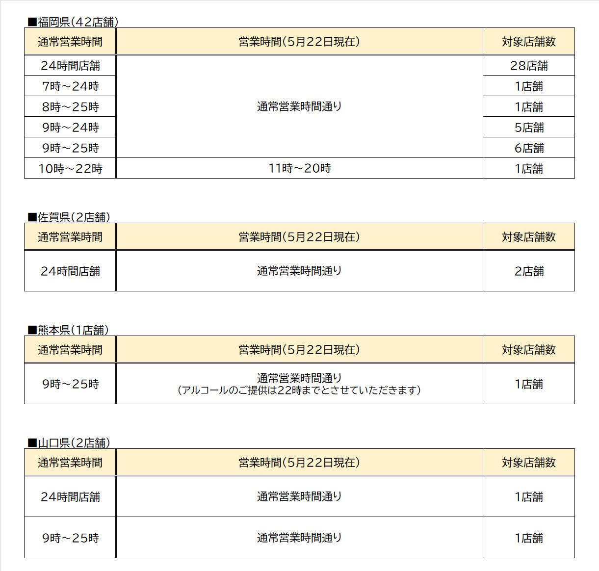 5/22(金)~福岡県の24時間店舗(28店舗)・熊本県の店舗(1店舗)を通常営業時間に戻します!