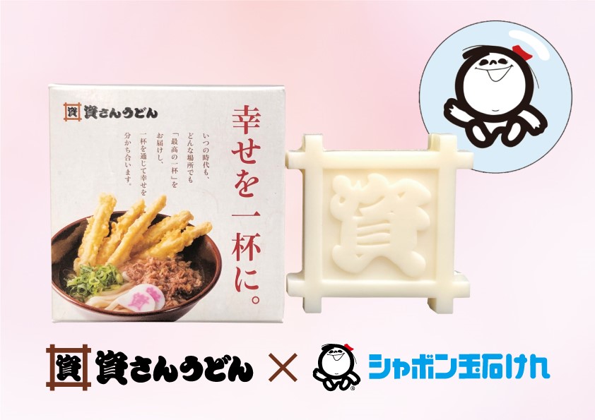 北九州を代表する企業であり、化学物質や合成添加物を一切含まない無添加石けんの製造・販売を行っている「シャボン玉石けん株式会社」とコラボレーションし、資さんうどんオリジナル石けんを製作しました!!無添加石けんのパイオニアである「シャボン玉石けん」と初めてタッグを組んで、北九州発祥の企業同士のコラボレーションが実現!!「資さんうどんオリジナル石けん」が誕生しました!このコラボレーションを記念して、6月1日(月)午前9時~自社通販サイト「資さんストア」内、対象商品ご購入のお客さまに「資さんうどんオリジナル石けん」をもれなくプレゼントさせて頂きます!北九州発祥の企業同士が製作した激レアコラボ石けんを入手するチャンスをぜひ、お見逃しなく!