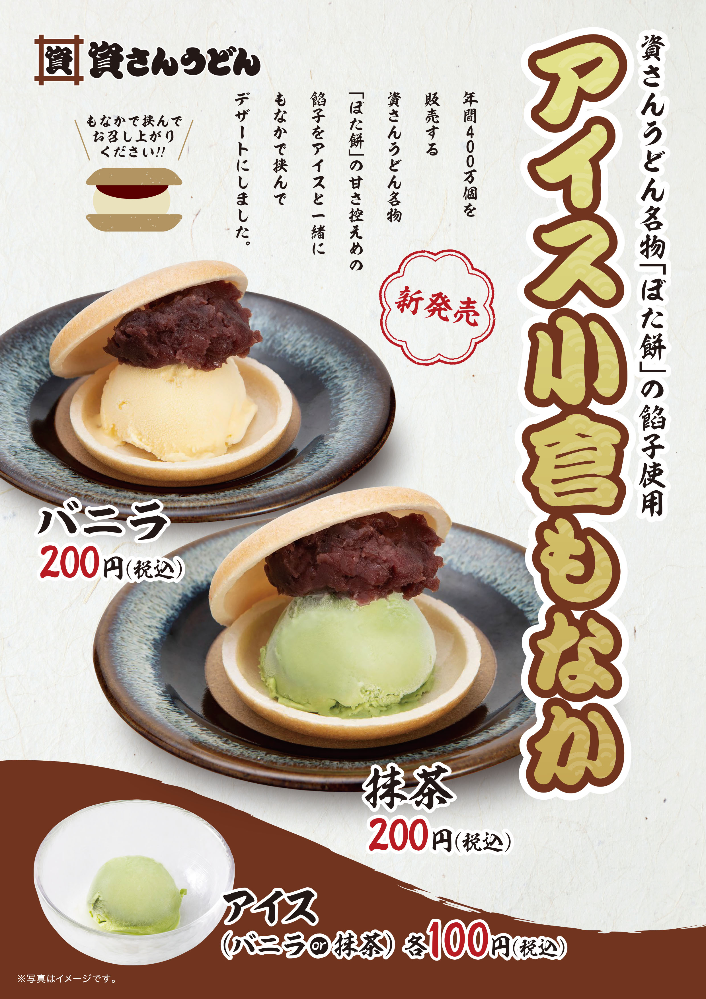 「アイス小倉もなか」の販売好評につき、7月10日(金)より、販売店舗を拡大します(31店舗)。資さんうどん名物「ぼた餅」の餡子を使用した「アイス小倉もなか(バニラ・抹茶)」と、お子さまのデザートにもちょうど良いサイズの「アイス(バニラ・抹茶)」が新登場!「資さんうどん」に新たに登場した‟デザート”をぜひ、お楽しみください!!