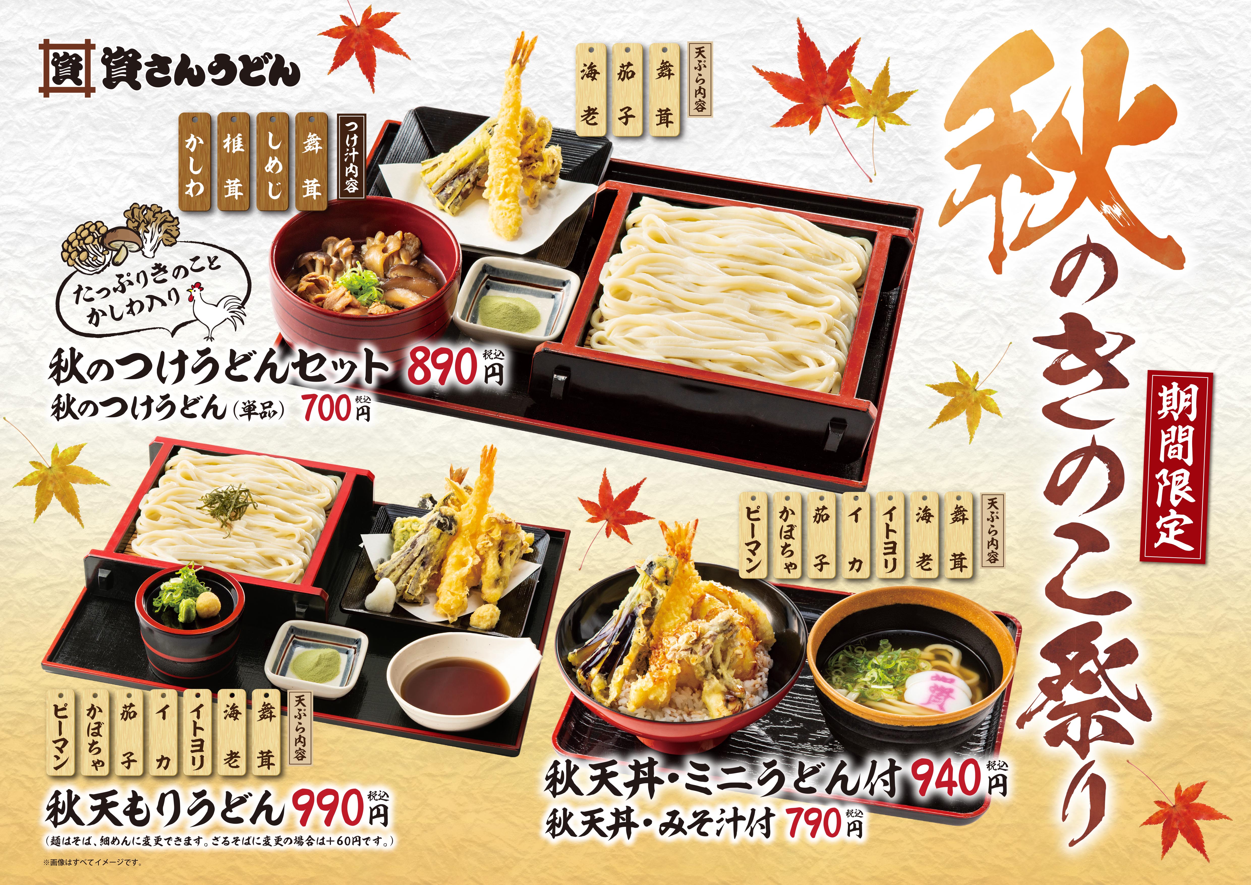 秋の味覚「きのこ」が入った人気の「秋天丼」や「つけうどん」等3種のメニューが登場!!