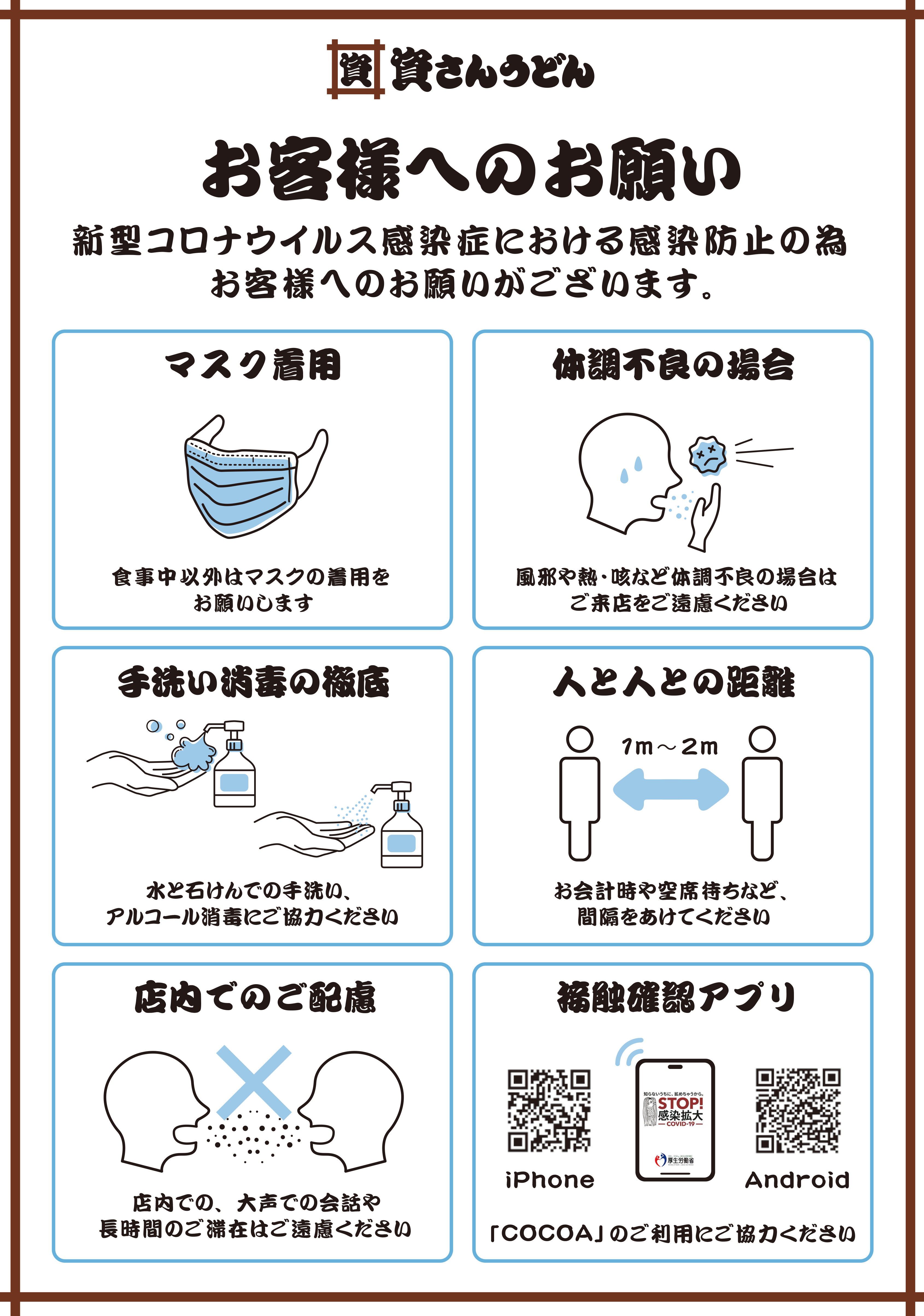 資さんうどんでは、新型コロナウイルス感染症対策を店舗にて行っておりますが、合わせてお客さまへのお願いの掲示を合わせて行っております。お客さまにはご不便をおかけしますが、ご協力のほど、何卒、宜しくお願い致します。