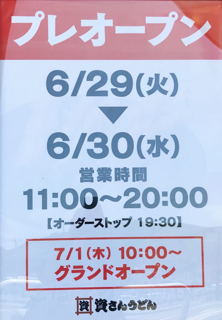 資さんうどん唐津店は、本日6月29日(火)・30日(水)の2日間、プレオープンを実施しています。営業時間は、11時~20時(オーダーストップ19:30)となります。時間短縮での営業とはなりますが、通常のご注文頂けます。なお、グランドオープンは7月1日(木)午前10時となります。唐津の皆さまに愛されるお店になれるよう頑張りますので、ぜひ、宜しくお願い致します。