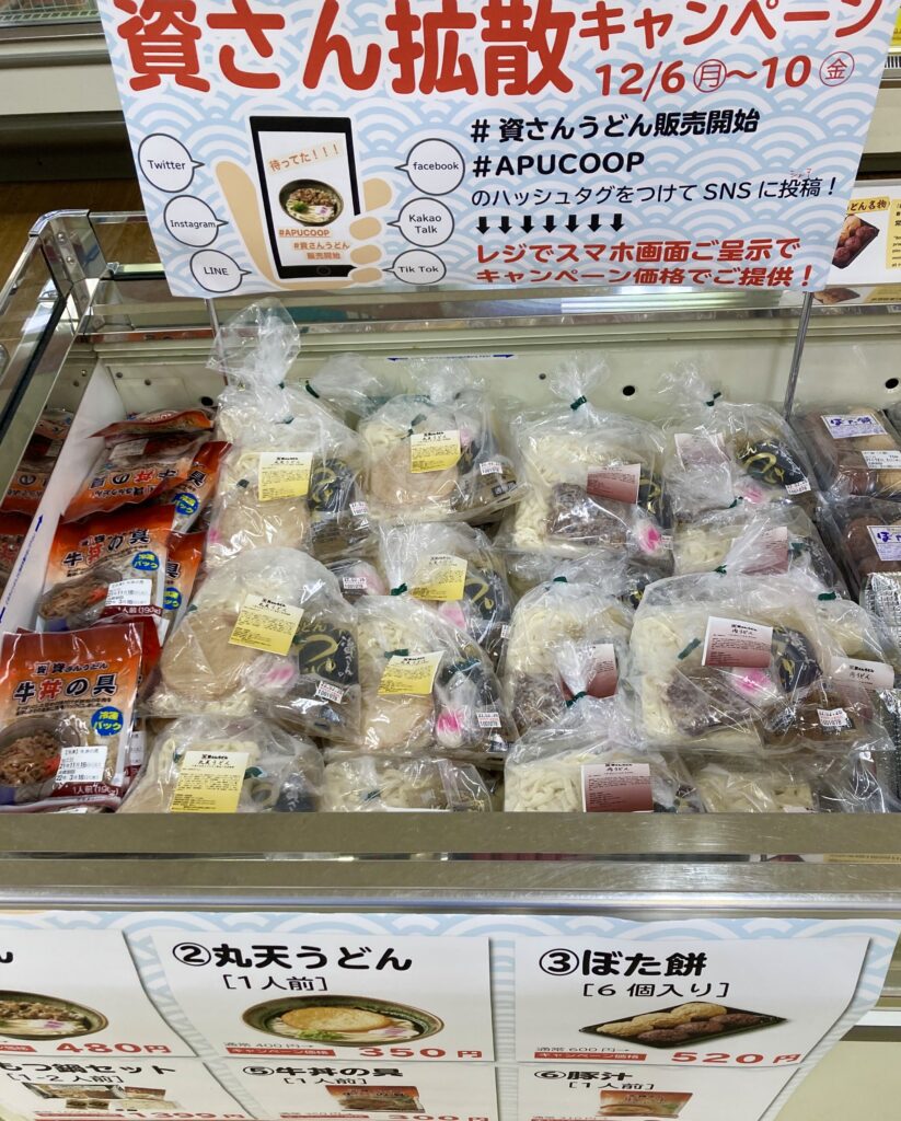本日12/6(月)〜 大分県別府市の立命館アジア太平洋大学(APU)内生協にて、資さんうどん の各種商品販売開始しました!12/6〜10の期間は、お得に商品が購入出来る「資さん拡散キャンペーン」実施中です。肉うどん・丸天うどん・名物ぼた餅等販売中です!この機会にぜひ、お試しください!