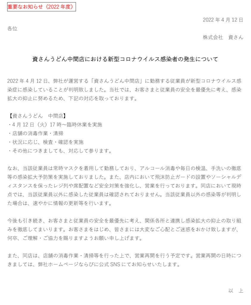 4月12日(火)、弊社が運営する資さんうどん中間店の店舗従業員に新型コロナウイルス感染が確認されました。当社では、お客さまと従業員の安全を最優先に考え、感染拡大の抑止に努めるため、4月12日(火)17時に臨時休業とさせていただきました。現在、保健所等からの指導等は無い状況ではございます。また、店舗消毒・清掃等ならびに状況に応じ、検査・確認を行った上で、営業再開を行う予定です。営業再開の日時につきましては、弊社ホームページならびに公式SNS 等にてお知らせ致します。お客さまをはじめ、皆さまには大変なご心配とご迷惑をお掛け致しますが、何卒、ご理解・ご協力を賜りますようお願い申し上げます。