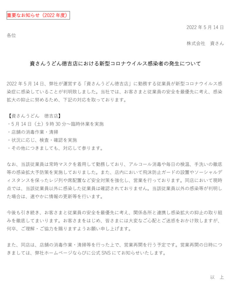 5月14日(土)、弊社が運営する資さんうどん徳吉店の店舗従業員に新型コロナウイルス感染が確認されました。当社では、お客さまと従業員の安全を最優先に考え、感染拡大の抑止に努めるため、5月14日(土)9時30分に臨時休業とさせていただきました。現在、保健所等からの指導等は無い状況ではございます。また、店舗消毒・清掃等ならびに状況に応じ、検査・確認を行った上で、営業再開を行う予定です。営業再開の日時につきましては、弊社ホームページにてお知らせ致します。お客さまをはじめ、皆さまには大変なご心配とご迷惑をお掛け致しますが、何卒、ご理解・ご協力を賜りますようお願い申し上げます。