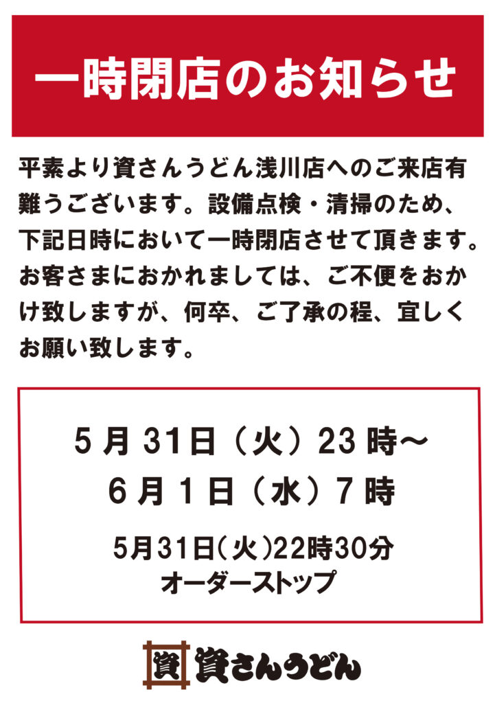 平素より資さんうどん浅川店をご愛顧いただき、誠にありがとうございます。店舗設備点検・清掃実施のため、勝手ながら、下記日時において一時閉店とさせていただきます。皆様におかれましては、ご迷惑・ご不便をおかけしますが、何卒、ご理解・ご了承のほど、宜しくお願い致します。