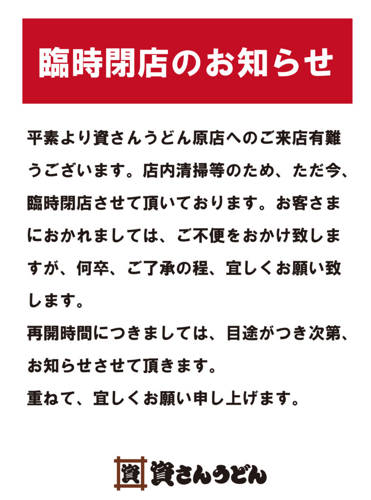 資さんうどん原店臨時休業のお知らせ