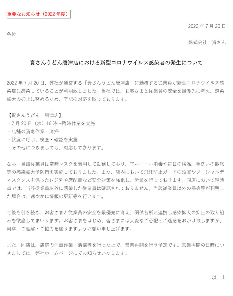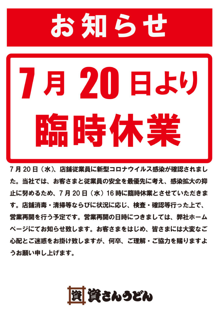 7月20日(水)、弊社が運営する資さんうどん唐津店の店舗従業員に新型コロナウイルス感染が確認されました。当社では、お客さまと従業員の安全を最優先に考え、感染拡大の抑止に努めるため、7月20日(水)16時に臨時休業とさせていただきます。現在、保健所等からの指導等は無い状況ではございます。また、店舗消毒・清掃等ならびに状況に応じ、検査・確認を行った上で、営業再開を行う予定です。営業再開の日時につきましては、弊社ホームページにてお知らせ致します。お客さまをはじめ、皆さまには大変なご心配とご迷惑をお掛け致しますが、何卒、ご理解・ご協力を賜りますようお願い申し上げます。
