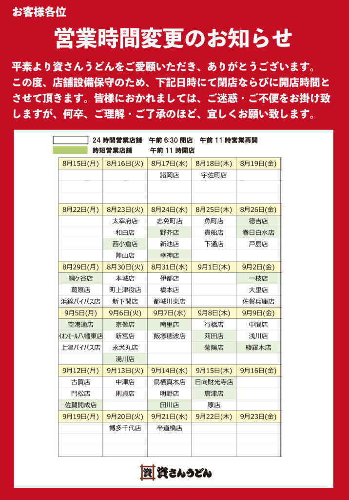 平素より資さんうどんをご愛顧いただき、誠にありがとうございます。資さんうどん各店では、設備点検保守作業により、下記の表の通り、一時閉店ならびに開店時間の変更をさせて頂きます。弊社の都合により、皆さまに置かれましては、ご不便・ご迷惑をお掛け致しますが、何卒、ご理解・ご了承の程、宜しくお願い致します。