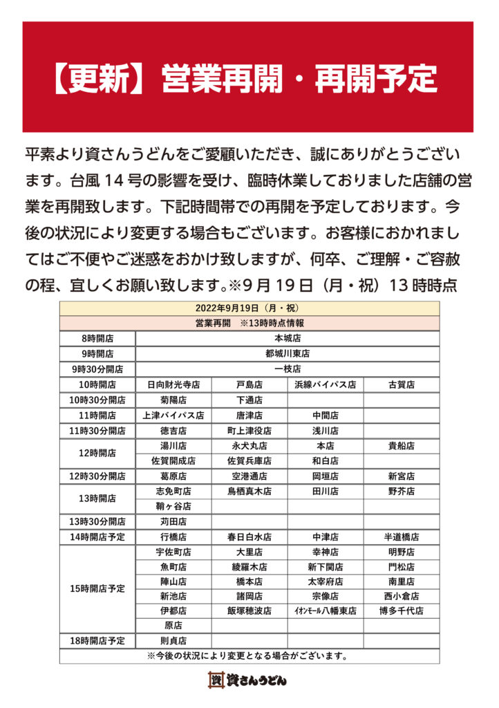 平素より資さんうどんをご愛顧いただき、誠にありがとうございます。台風14 号の影響を受け、臨時休業しておりました店舗の営業を再開致します。下記時間帯での再開を予定しております。今後の状況により変更する場合もございます。お客様におかれましてはご不便やご迷惑をおかけ致しますが、何卒、ご理解・ご容赦の程、宜しくお願い致します。※9 月19 日(月・祝)13 時時点