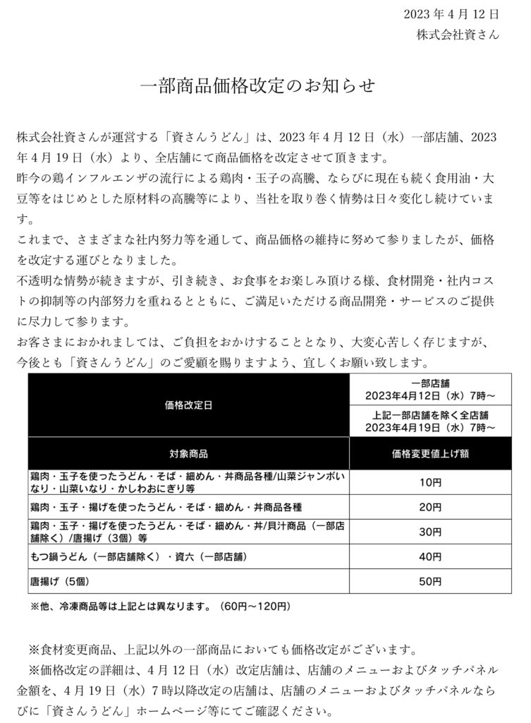 4月12日(水)一部店舗、4月19日(水)一部店舗を除く全店舗にて、以下の通り一部商品の価格を改定させて頂きます。何卒、ご容赦・ご理解、今後とも変わらぬご愛顧をお願い申し上げます。※ホームページ「おしながき」の価格記載につきましては、4月19日(水)~変更とさせていただきます。4月12日(水)~価格改定の一部店舗の金額につきましては、大変お手数ではございますが、店舗メニュー・タッチパネル表示の金額を優先とさせていただきます。重ねて、宜しくお願い申し上げます。