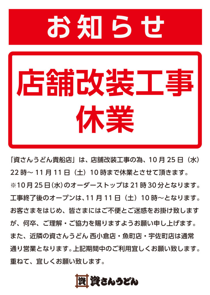 「資さんうどん貴船店」は、店舗改装工事の為、10月25日(水)22時~ 11月11日(土)10 時まで休業とさせて頂きます。※10 月25日(水)のオーダーストップは21時30 分となります。