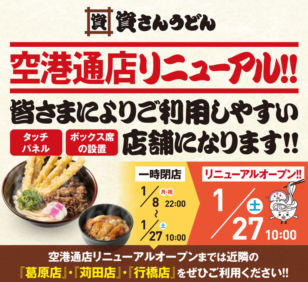 「資さんうどん空港通店」は、店舗改装工事の為、1月8日(月・祝)22時~ 1月27日(土)10 時まで休業とさせて頂きます。※1 月8日(月・祝)のオーダーストップは21時30 分となります。