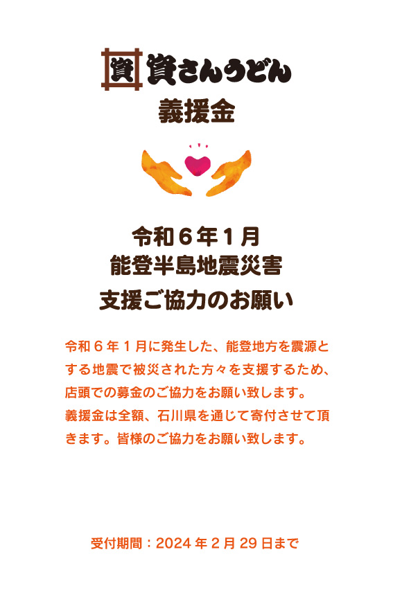 1月1日に発生した能登半島地震、1月3日に発生した鳥町食道街での大規模火災にて被災された皆さまへの義援金募金を資さんうどん各店にて行っております。