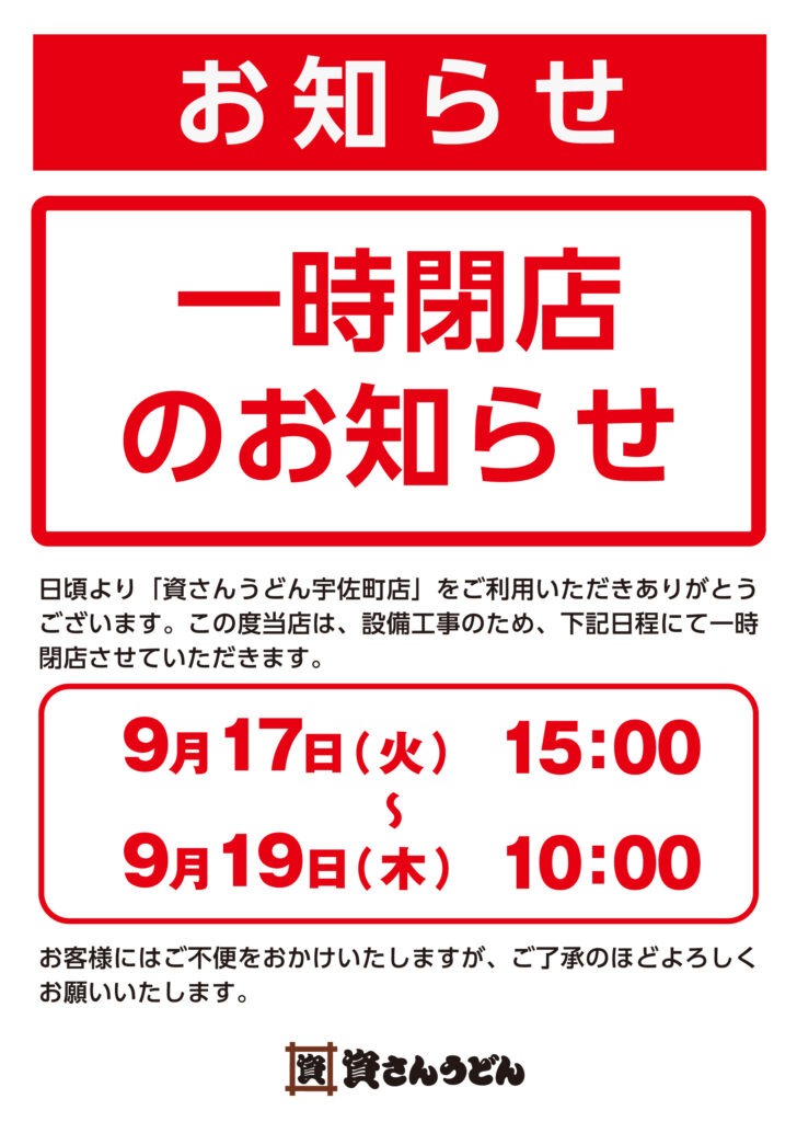 平素より資さんうどん宇佐町店をご愛顧頂き、誠にありがとうございます。